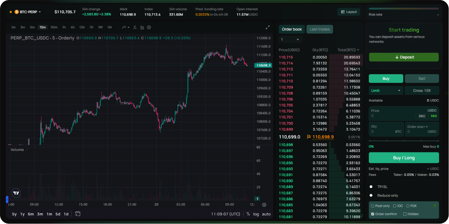 Connect your Web3 wallet (Trust Wallet, MetaMask etc), fund it with supported assets, and start trading directly on-chain — no account or KYC required.